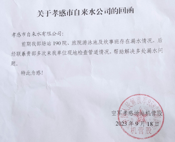 除此之外,再與工作人員的溝通中我們得知,該院內(nèi)新建的一處游泳池一直無法通水,秉持著讓用戶滿意的服務(wù)理念,我公司技術(shù)人員馬不停蹄義務(wù)幫助其查明原因,恢復(fù)正常通水,解決了用戶的各種用水問題。事后,為了感謝我公司高效率高質(zhì)量的為民服務(wù),空軍孝感廠站機(jī)營股工作人員特意送來了感謝信。