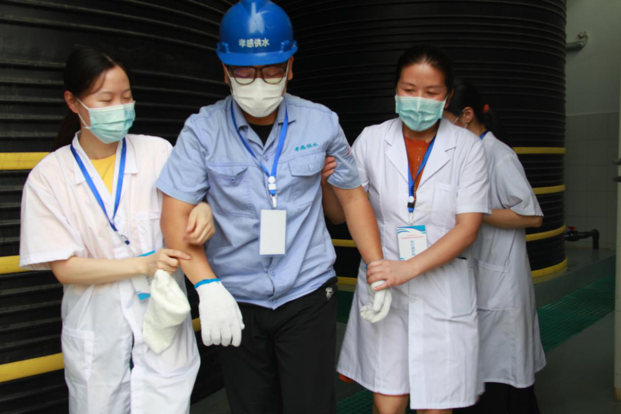 此次演練是以正在使用中的儲液罐的底部破裂,導致次氯酸鈉大量外泄為背景。當天上午9:30分,演練正式開始。值班人員在巡視過程中被次氯酸鈉藥劑噴濺至手臂受傷,值班班長立即報告總指揮,總指揮下令立刻全面啟動次氯酸鈉應急處置預案,通訊聯絡組、醫療救護組、安全疏散組、現場處置組前往現場開展救援及搶修。