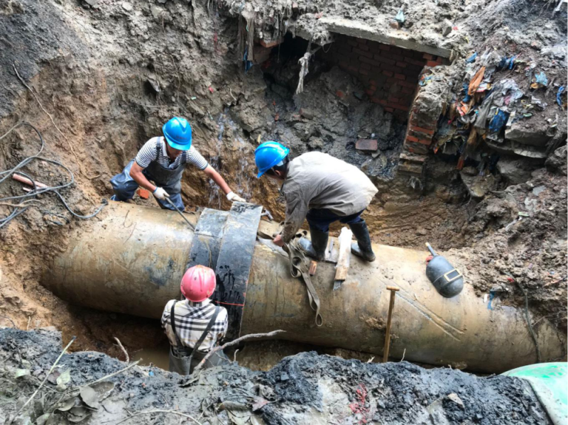 18日下午6點(diǎn),DN800管道漏點(diǎn)終被挖出,原因是兩根水泥管道連接處經(jīng)過天長日久的熱脹冷縮而發(fā)生漏水。考慮到停水作業(yè)將會影響用戶的正常需求,在管道挖出后,搶修人員發(fā)揮分工協(xié)作的高效作風(fēng),一組進(jìn)行人工清理操作坑底和管上的淤泥,一組負(fù)責(zé)備料,一組關(guān)閘調(diào)水。下午7點(diǎn),材料到位,操作坑內(nèi)5名維修人員加緊手中動作,一刻不停進(jìn)行管道清理、搶修節(jié)包裹、擰螺栓……19日凌晨,經(jīng)過14個小時(shí)的緊急搶修,DN800供水管道維修工作順利完成,主城區(qū)全面恢復(fù)正常供水。